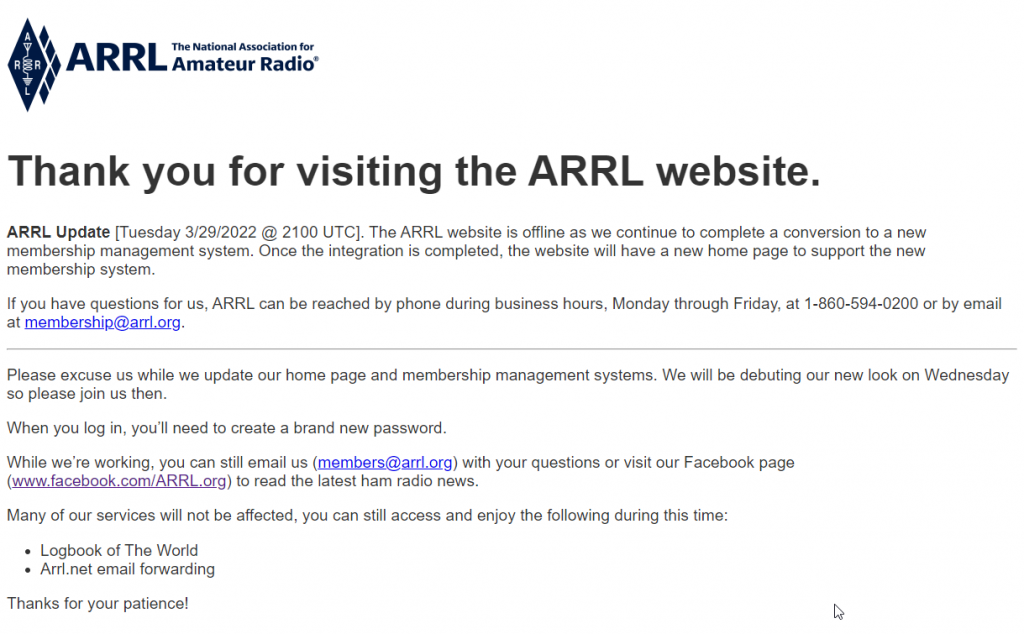 ARRL.org is currently offline for maintenance and conversion to a new membership management system. It’s been offline since last week about Thursday (3/24/2022) and was expected to be back up by NET Tuesday.